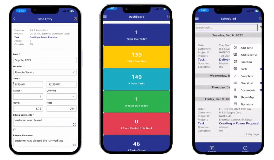 Time, expense, photos, signatures—syncs the moment connectivity returns parts, assets, travel.