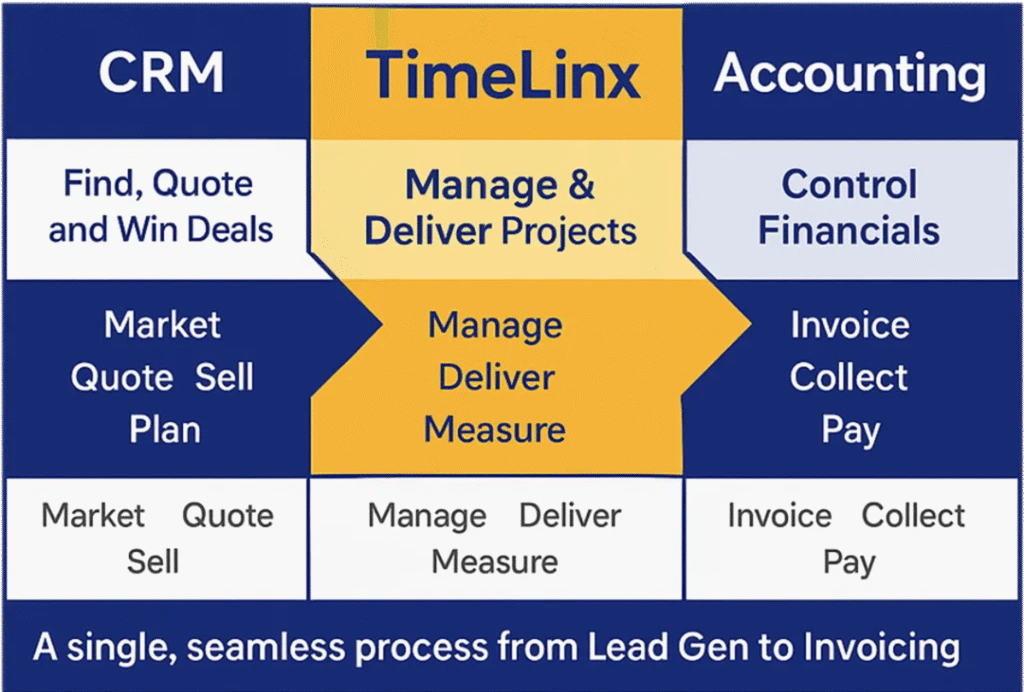 TimeLinx is the only end‑to‑end project and service management platform that connects Sage CRM with Sage ERP’s to deliver real‑time financial control as work happens throughout the complete customer lifecycle —not weeks later.
